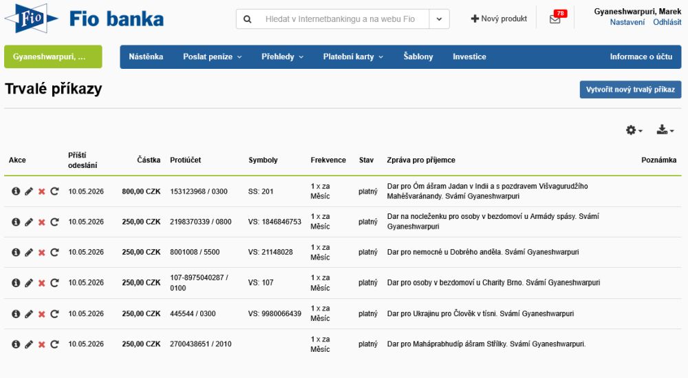 Svámí Gyaneshwarpuri přijímá dary na principu almužny do mnišsko- žebrácké misky