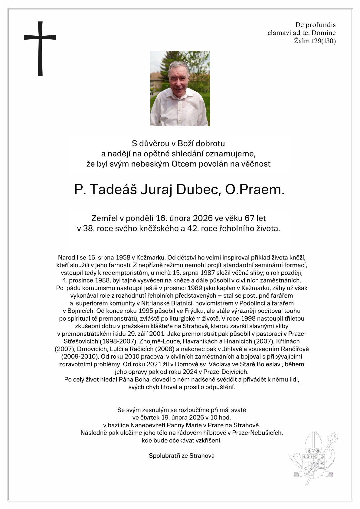 Zemřel bývalý farář ve Křtinách P. Juraj Tadeáš Dubec O.Praem.